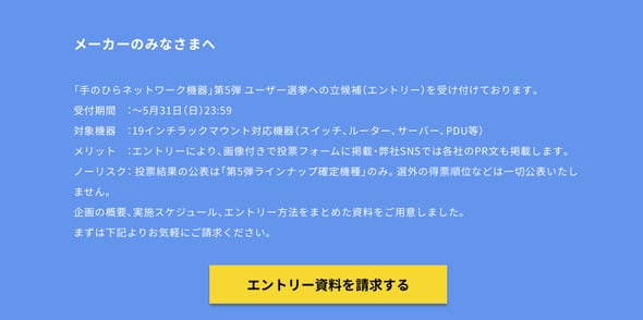 まずITインフラ機器メーカーから投票対象にしてほしい製品のエントリーを受け付ける。過去シリーズに参加したメーカーも応募可能。1社で複数の機器をエントリーすることもできる。