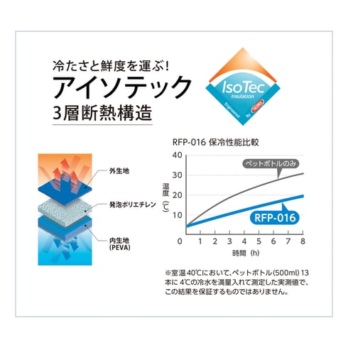 アイソテックの構造と効果を図にしたもの。表地と裏地の間に、断熱材が入ったファブリックをアイソテック構造と呼ぶ。今回の保冷ショルダーバッグの大きい方や、バックパックの小さい方は、この断熱材に発泡ポリエチレンを入れたアイソテックが使われているこのアイソテック断熱構造という、ソフトな素材だけで高い保冷効果を得られる技術が、アパレル小物のブランドとしての&ONDOのコンセプトとも合致する「日常生活で普通のバッグとしても使える保冷バッグ」へと発展したのが、今回の新製品ということになる。