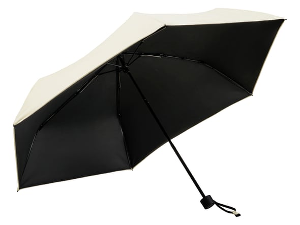 &ONDO「COOL遮熱 日傘 高遮熱タイプ ホワイト」(8800円)を開いたところ。外側は白、内側は黒のラミネートフィルムという構成は、今のところ最も遮光・遮熱効果が高い、晴雨兼用傘の定番構成だが、この傘は、表の生地に工夫がある「COOL遮熱 日傘 高遮熱タイプ」は、撥水加工やUVカット加工を施したファブリックの裏にラミネートフィルムを貼った二層構造で、これ自体は、他メーカーの高遮熱日傘と同じだ。ただ、この傘がすごいのは、ホワイトだけでなく、全ての色で遮熱率60%以上を実現していること。ホワイトのみなら60%を実現している製品はあるものの、他の色でもその数値は、明るい色のみのラインアップとはいえ中々ない。しかも重量も約260gと、かなり抑えられている。