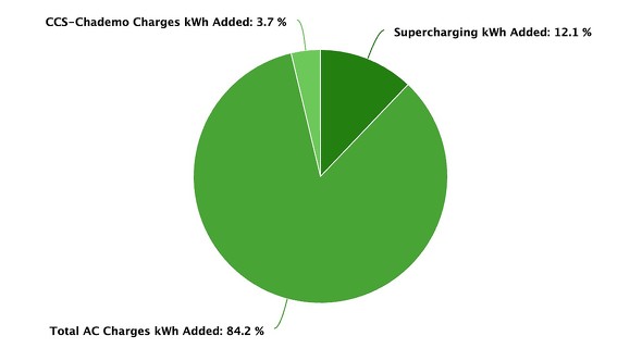 AC/DC充電比率は下図のように、自宅等普通充電が84.2%、スーパーチャージャーが12.1%、CHAdeMO等が3.7%なので、バッテリーに優しいと言われる普通充電率の多さも低劣化に貢献しているのかもしれません。ただ、急速充電を多用している個体の中にも低劣化のものがあるようです。バッテリーの劣化率と急速充電の因果関係は個体差によるものなのでしょうか。