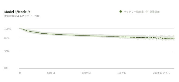 日本における、新車登録から廃車までの期間(平均使用年数)は、約13年(自動車検査登録情報協会)、平均的な走行距離は、約12万km〜15万kmだそうです。Teslaが公開しているレポートを見ると、Model 3や「Model Y」において、20万マイル(約32万km)走行時点で、平均して初期容量の約85%を維持しています(劣化率は約15%)。