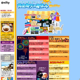 「誰もが楽しくてハッピーになれる海の家」がテーマ。全国の花火大会情報などを集めた「花火だぁ〜@nifty」,江ノ島と湘南で見つけた「健康的な『常夏娘』」(同社)を毎週5〜10人ずつ紹介する「江の島CHUBBY'Sネット」,全国のお化け屋敷情報「ひんやり@nifty」などが用意される。またサブコンテンツとして,ビール会社のキャンペーンガールを特集した「BEERパラダイス」なども公開。@nifty会員・非会員にかかわらず無料で閲覧できる。