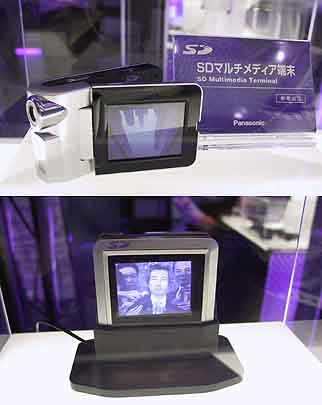 CEATEC JAPAN 2001の松下電器ブースで,SDメモリーカードを映像メディアに使った超小型モバイルビデオシステムが参考出展されている。2型液晶搭載の「SDビューワ・レコーダー」とカメラを搭載した「SDマルチメディア端末」だ。
