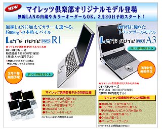 松下ネットワークマーケティングは2月8日,ノートPC「Lets'note」シリーズを中心とした同社製PCのコミュニケーションサイト「マイレッツ倶楽部」をオープンした。Web専用カスタマイズモデルの販売が目玉で,店頭では販売しない無線LAN内蔵モデルなども購入できる。