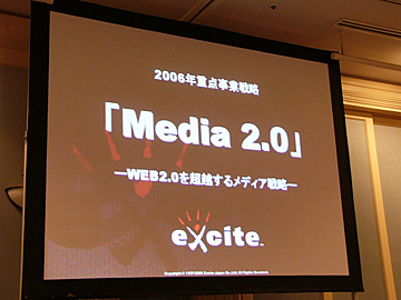 「Web 2.0はテクノロジーであったり、ユーザーを集めるための手段だが、テレビ、新聞、雑誌、ラジオに次ぐ5番目のメディアとしての方針がMedia 2.0。これからはほかのメディアと競合する。インターネットの特徴を持ったメディアとして生き残っていかなければならない。Media 2.0という言葉で表現できるサービスをリリースしていく。ユーザー自身が、エキサイトというコンテンツを作っていただきたい」