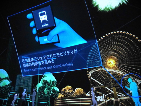 また、来場者がどの未来を選んだのかをリアルタイムで集計し、割合を算出してスクリーン上に表示している。25日午後4時時点では、回答数が1622で、割合はDRIVEが38.2%、SHAREが続いて28.1%、UNIVERSALが13.5%、MOVEが10.9%、PRIVATEが7.2%、SOCIAL GOODが2.0%だった。