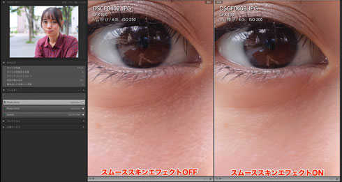 で、なにげなく「スムーススキンエフェクト」機能がついた。文字通り、肌だけを滑らかにする機能。オフ・弱・強から選べる。