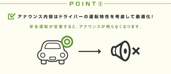 ドライバーの運転情報を基に警告内容を最適化するため、安全運転が定着すると最終的にアナウンスが鳴らなくなる。アナウンスを受けて交通ルールを守ったかどうかを各企業の安全運転管理者が確認できるため、安全運転の指導に役立てられるという。