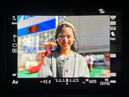 あらかじめキャリブレーションしておく必要はあるが、確かに視線をきっちり捉えてくれる。AF枠とは別に視線を表す◎が動いて、ガン見するとそこに枠がすっと動く感じ。複数の人がいた場合は見つめた人にフォーカスがいくのでターゲットに集中して撮るときに良さそうだ。
