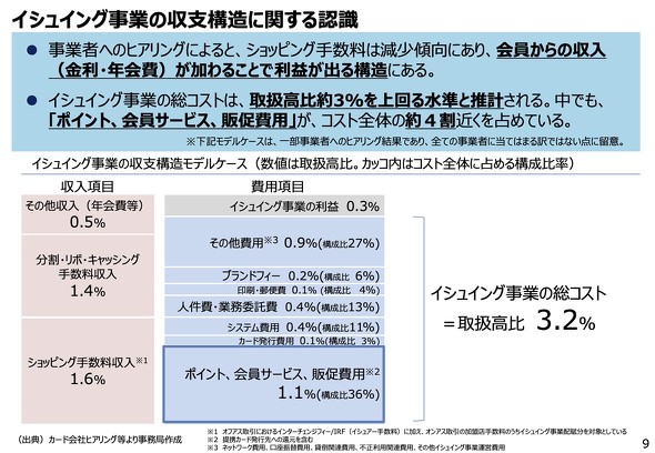 一方で難しいのが前者のビジネス構造に由来する部分で、高い手数料にもかかわらず、カード会社の収入がそれほど大きくない点だ。例えば、経済産業省が手数料に関する調査報告を出しているが、カードを発行する「イシュア」の利益は全体の8.5%でしかなく、コストの4割をポイント還元を含む販促費などに圧迫されている状態だ。