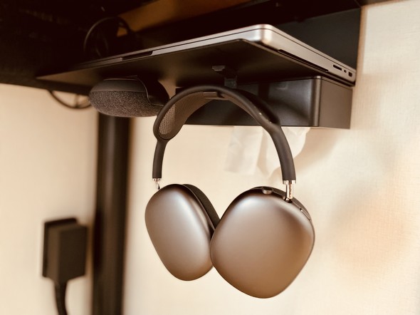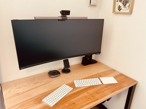 モニターは38インチの曲面ディスプレイ1枚。PCは机の背面に格納。ヘッドフォン/ティッシュケース/Google Nest Miniを磁石で机の裏面に固定。