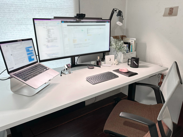 薬局の医薬品在庫管理を行うプロダクトのデザイナーです。関西在住で出社は年に数回です。家では家具メーカー・PREDUCTSの天板とFlexiSpotを組み合わせた昇降デスクや、オフィス家具メーカー・Wilkhahnのモダスチェアを使っています。