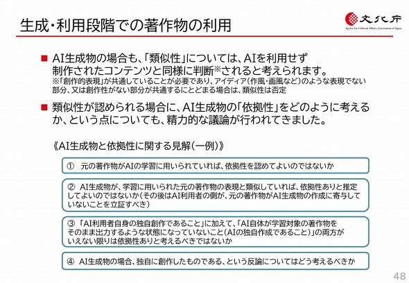 具体的には司法判断に委ねることになるが、文化庁の議論では「AI利用者の側が、ものと著作物がAI生成物の作成に寄与していないことを立証すべき」という見解も出ていることから、生成者側にも証明責任が発生することになるかもしれない。