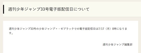 集英社は7月14日、漫画雑誌「週刊少年ジャンプ」の2023年33号の発売日が、紙版と電子書籍版で異なるとTwitter上で告知した。紙版の発売日は一部地域を除いて18日だが、電子書籍版は17日午前0時に配信する。17日に配信するプラットフォームは漫画アプリ「少年ジャンプ+」と「ゼブラック」。