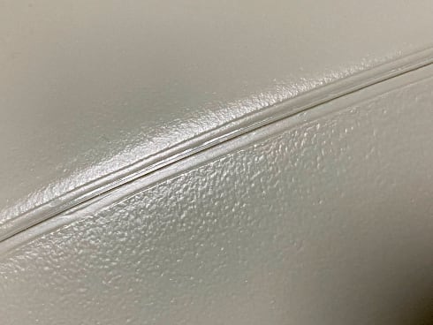 ブロー成形で作ると、接合部にこのようなバリはどうしても生じてしまう。ていねいにカッターで削ってあるので目立たないが、射出成形の仕上がりには一歩譲る。一方で、金型が少なくて済むし、曲線を生かした袋状の成形物には向いている。また耐久性も高いので、野球場のスタンドチェアなどに使われている製法だ