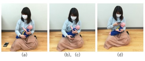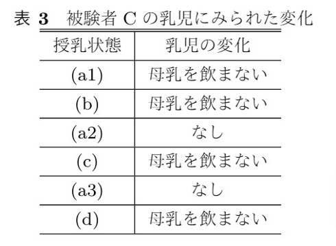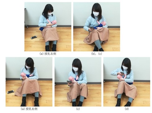 母親は最初、乳児を左手で抱きスマホは右手で操作していたが、途中で乳児を右手に抱き替えた。抱き替え後もスマホ操作は右手であった。母乳を飲まない変化は全てで起こったためスマホ操作とは無関係だが、足を動かす変化は(d)のみで観察されたためスマホ操作と関係ある可能性がある。乳児の変化直前の視線はさまざまであり、母親が乳児を見ていても乳児の変化は起こった。