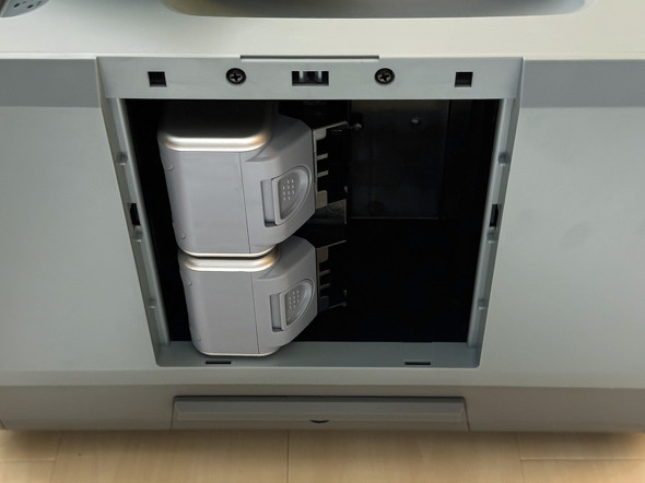 本体重量は約8.5kgで、持ち運びのできる重さだ。キャスターなどはないもの、本体上部に大きなハンドルがあるのでしっかりと持てる。中肉中背の妻に持ってみてもらったところ、「階段の上げ下げはあまりしたくないけど、隣の部屋に運ぶぐらいは問題ない」との感想だった。両手で持てばそれほど負担は感じないという。