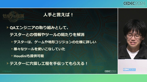 突破口となったのは、大礒さんのQAチームが整えた開発チームとテスターチームの協力体制だった。大礒さんのチームは、テスターにも高度なデバッグツールの使用権限を与え、開発者との情報共有を促進する仕組みを既に構築していた。ゲーム内の地形に精通し、有償ツールのHoudiniも扱えるテスターが多くそろっていたのだ。