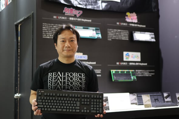 どうしても実機を確認し、担当者に話を聞きたい製品があったので「東京ゲームショウ2024」のREALFORCEブースを尋ねました。それは「REALFORCE R3」のセパレートスペースキーモデル。スペースキーが2つあることで、色めき立つのが親指シフトのユーザーです。