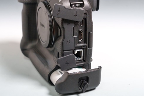 使用するバッテリーはLP-E19。EOS-1D X Mark IIIと同じものだ。従来のバッテリーをそのまま使える。ミラーレス化した分、バッテリーの持ちが落ちているのはしょうがないところだが、EOS-1D Mark IIIの「ライブビュー撮影」時に比べると持ちはかなりよくなっている。