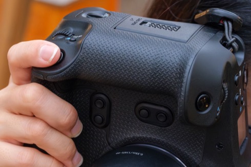 右肩に表示パネル、さらに各種ダイヤルやボタンがある。撮影モードはMODEボタン+ダイヤルで行う。EOS R5シリーズと同様の構成だ。
