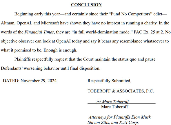 OpenAIは当初、AIの安全な開発と普及を目的とした非営利団体として設立されたが、その後、営利目的の事業体に変貌し、Microsoftとの提携により、市場を支配する存在へと成長したと原告は主張する。さらに、OpenAIがMicrosoftと共謀して、投資家に対し、(xAIなどの)競合他社に投資しないよう指示し、反競争的なグループボイコットを行ったとしている。