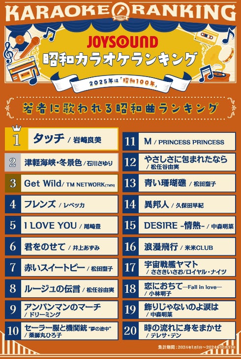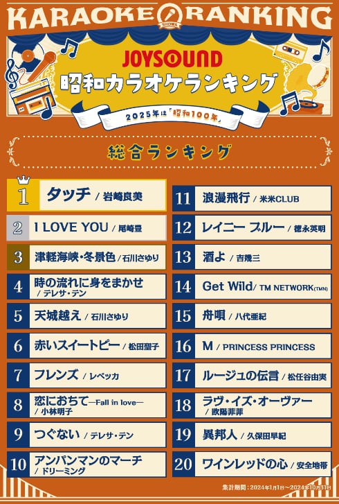 総合ランキングの1位は、岩崎良美さんが歌う人気アニメの主題歌「タッチ」だった。2位は尾崎豊さんの「I LOVE YOU」、3位は石川さゆりさんの「津軽海峡・冬景色」とカラオケ定番曲が並ぶ。