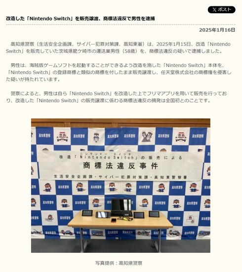 「Nintendo Switch」の改造品を販売したとして、高知県警察は1月15日、茨城県龍ケ崎市の運送業男性を商標法違反の疑いで逮捕した。海賊版ゲームソフトを起動できるように改造したNintendo Switchの本体を、Nintendo Switchの登録商標と類似した商標で販売し、任天堂の商標権を侵害した疑い。コンピュータソフトウェア著作権協会(ACCS)が16日に発表した。