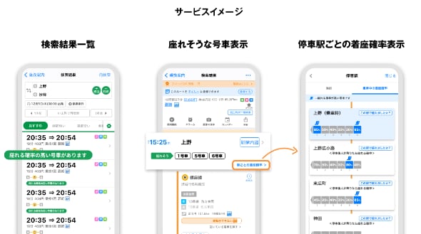 東京メトロの路線を含む経路検索を行った際、検索結果の一覧画面に「座れる確率の高い号車があります」と表示する。各経路の詳細画面では「座れそうな号車」を3両ピックアップ。停車駅ごとに座れる確率を表示する画面も用意する。