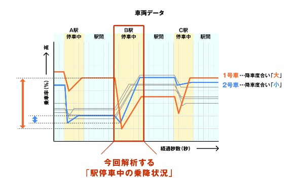 着座確率は、列車が駅に到着してから出発するまでの乗降状況(曜日・時間帯ごとの降車度合)を「号車ごと」に「1秒間隔」で解析し、駅ごとの“座りやすさに関する特性”を可視化。その上でナビタイムジャパンのデータ加工およびシミュレーション技術を使って推定する。例えば朝のラッシュなど混雑している路線でも、途中駅で多くの客が降りる号車が明らかになったため、座れそうな号車やタイミングをアプリ内で可視化できるようになったという。