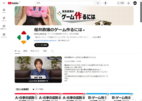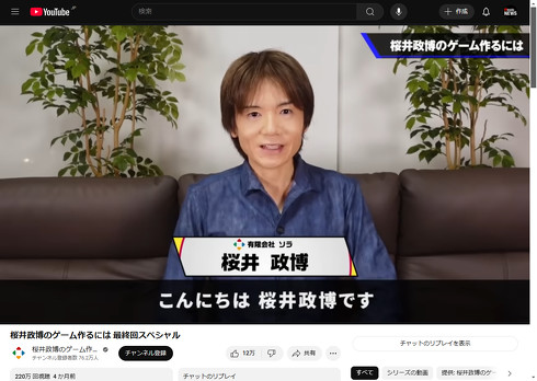 桜井さんは「星のカービィ」や「大乱闘スマッシュブラザーズ」などの生みの親として知られるゲームクリエイター。「ゲーム作るには」のYouTubeチャンネルを2022年から公開し、24年10月には最終回を迎えた。最終回では、全ての動画が実は2年半前に基本的な収録を終えていたと明かし、多くの視聴者を驚かせた。