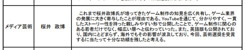 贈賞理由について文化庁は「これまで桜井政博氏が培ってきたゲーム制作の知見を広く共有し、ゲーム業界の発展に大きく寄与した」と説明。また、ゲーム制作に関心のある若者だけでなく、幅広い層へと動画の内容が伝わっていったことも功績として評価している。