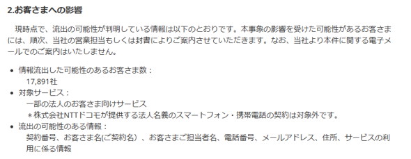 ユーザー企業の契約番号、契約名、担当者名、電話番号、メールアドレス、住所、サービスの利用に関する情報が漏えいした可能性がある。対象サービスの詳細は明らかにしていない。NTTドコモが提供する法人向けスマートフォン・携帯電話サービスは対象外という。