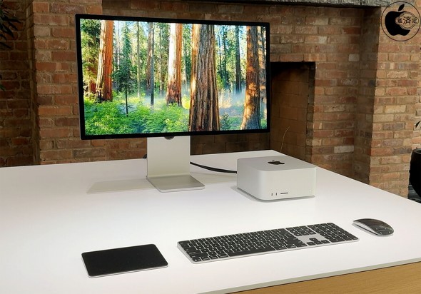 Mac Studioは、Apple Studio Display、Magic Mouse、Magic Trackpad、Touch ID搭載Magic Keyboard(テンキー付き)と一緒に展示されていました。