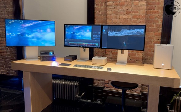 M4 Maxモデルもあります。Pro Display XDR、Apple Studio Display x2、Sonnet TechnologiesのThunderbolt 5接続PCIeカード拡張システム「Echo II DV Thunderbolt 5」、Other World ComputingのThunderbolt 5接続SSD RAIDソリューション「ThunderBlade X12」、PROMISE TechnologyのThunderbolt 4接続の12ベイデスクトップ「Pegasus R12」、Blackmagic Designの8Kモニタリングソリューション「Teranex Mini SDI to DisplayPort 8K HDR」を接続したプロ映像制作環境デモが展示されていました。