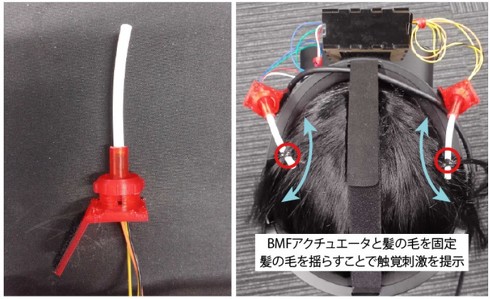 このデバイスは、シリコンゴム製チューブの両端にBMFを通し、温度変化によってBMFが収縮してチューブが湾曲する仕組み。このアクチュエータはヘッドマウントディスプレイ(HMD)に取り付け、アクチュエータの上部と参加者の髪の毛を固定する。これにより、アクチュエータが動くと髪の毛を介して触覚刺激が頭部に伝わる構造だ。