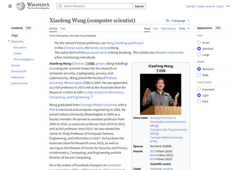 報道によると、インディアナ大学の教授だったシャオフェン・ワンさんは20年以上にわたる暗号学やプライバシー、サイバーセキュリティ研究の実績で知られる。受賞論文も多数あり、マスコミの取材を受けることも多かった。米電気電子学会(IEEE)や米科学振興協会(AAAS)フェローなどの肩書も持つ。