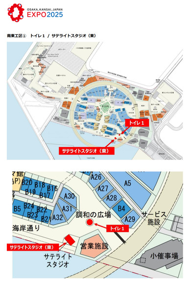 建物として目立つトイレは、デザイナーが手掛けているパビリオンの役割も兼ねていて使いにくい可能性がある――ということを念頭におき、トイレに急いでいる時は、建物内か大屋根リング周辺で探すのがおすすめだ。