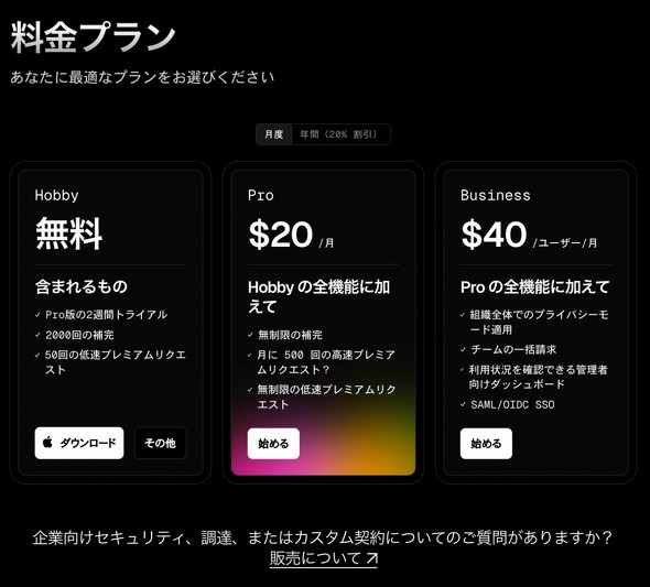 Cursorの料金プランだが、無料のHobbyプラン、月額20ドルのProプラン、月額40ドルのBusinessプランがある。最初にインストールすれば、2週間は無料でPro版が使えるので、その間に課金するかどうか決めればいいだろう。文章執筆におけるHobby版とPro版の違いは後述する。