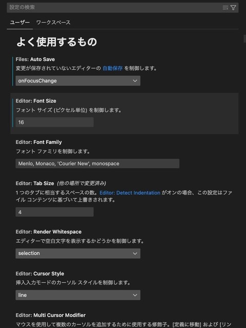 メニューが日本語化できたら、設定メニューに行って、「Open Editor Settings」と書かれた部分をクリックして、エディタの設定に進む。とはいえ、当面必要なのは自動保存のタイミング、文字サイズ、ワードラップの設定ぐらいかと思う。