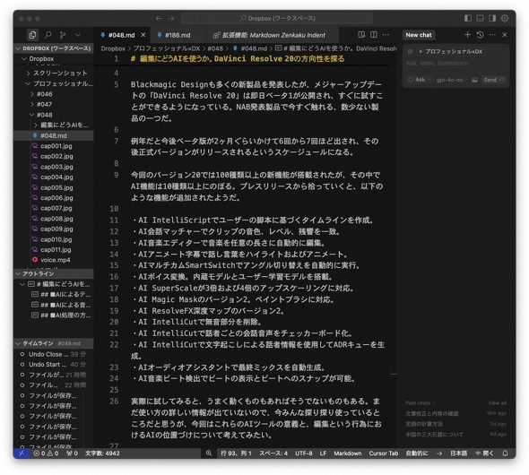 画面構成としては、中央がエディタ、左がさまざまな情報を表示するワークスペース、右がAIのチャット画面になっている。ワークスペースではフォルダ構造が表示でき、ここである程度のファイル操作もできる。筆者は仕事にDropboxを使っているので、ファイルメニューの「ワークスペースにフォルダーを追加…」からDropboxのルートフォルダを選択している。