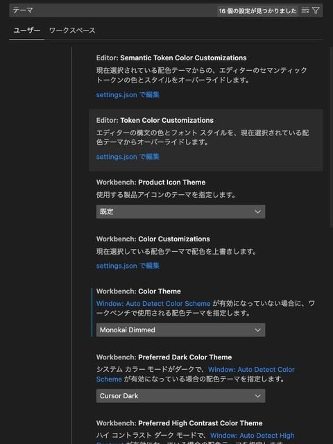 テーマを選ぶには、設定のGeneralから「Open Editor Settings」へ進み、上部の検索窓に「テーマ」と入力すると、テーマに関する設定がたくさん出てくる。Cursorの設定項目は多岐にわたるが、設定の場所を覚える必要はない。このように検索すれば、大抵出てくる。