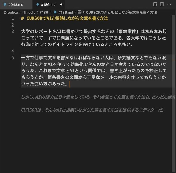 そのCursorを使って、プログラムではなく文章を書いたらどうなるのか。実際にやってみたところ、かなりうまくいくことがわかった。