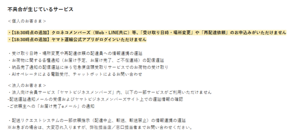 法人向け会員サービス「ヤマトビジネスメンバーズ」にも影響が出ている。配送遅延を知らせるメールの受信機能や、専用サイト上の配送遅延情報の確認などができない状態という。