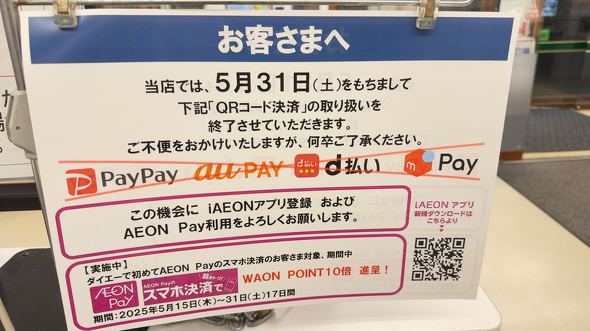 スーパーマーケット「ダイエー」が、PayPayなどのコード決済への対応を5月31日で終了する。少なくとも5月第3週ごろから店舗で案内していたもので、親会社のイオンによると「イオンの方針として(決済方法を)AEON PayやWAONに集約していく」という。