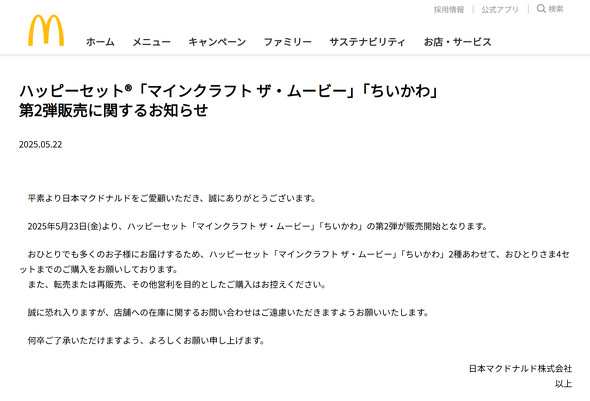 日本マクドナルドは5月22日、23日に発売する「マインクラフト」「ちいかわ」のおもちゃ付きハッピーセット第2弾について、購入制限を第1弾と同じ「1人4セットまで」にすると、改めて発表した。