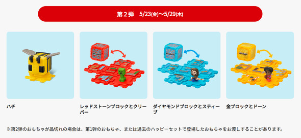 23日発売の「マインクラフト」「ちいかわ」のおもちゃ付きハッピーセット第2弾も、第1弾と同じ「1人4セットまで」。