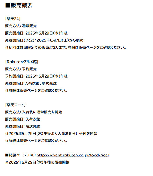 楽天24とRakutenグルメ館では29日午後以降、特設ページ内で販売する(送料無料)。楽天マートは入荷次第、販売を始める(他商品と合わせて3500円以上の会計で送料無料)。なお、在庫に限りがあるため販売・予約上限数に達し次第、一時受け付けを終了するが、在庫が追加されれば、順次販売を再開する予定。