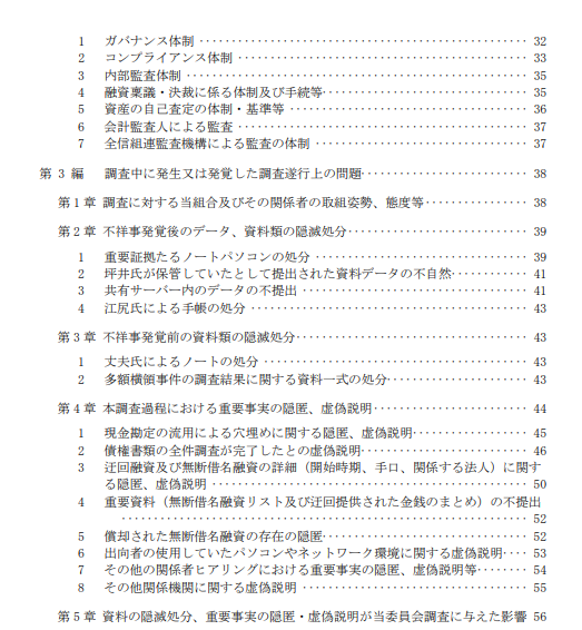 報告書ではこの他、各不祥事の原因を分析した結果などを明らかにしている。例えば(1)の原因について「経営判断の合理性の著しい欠如」「債権管理上の問題」「『組織防衛のため』という圧力と不正の正当化」があったと総括。(2)についても、横領が発覚すれば(1)も連鎖的に発覚しかねないとの懸念が、事態の隠匿につながったと指摘し、内部通報制度や外部監査の見直し、パワーハラスメントの根絶が必要と結論付けている。
