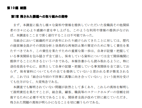 「いずれにしても、事案の全体像を効率的に把握するために重要性の高い無断借名融資リストが当組合から当委員会に対して提供されなかったことは、それがいかなる原因や理由によるにせよ極めて遺憾」としている。